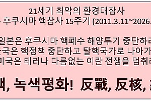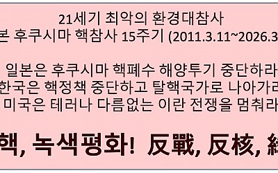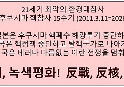 3월11일(수), 일본 후쿠시마 핵발전소 참사 15주기 (2011년), 동일본대지진 쓰나미피해로 후쿠시마 제1원전단지 1,2,3,4호 원자로 폭발 멜트다운, 원전반경20km 20여만명 원전피난민, 2023년부터 핵폐수 해양투기 계속