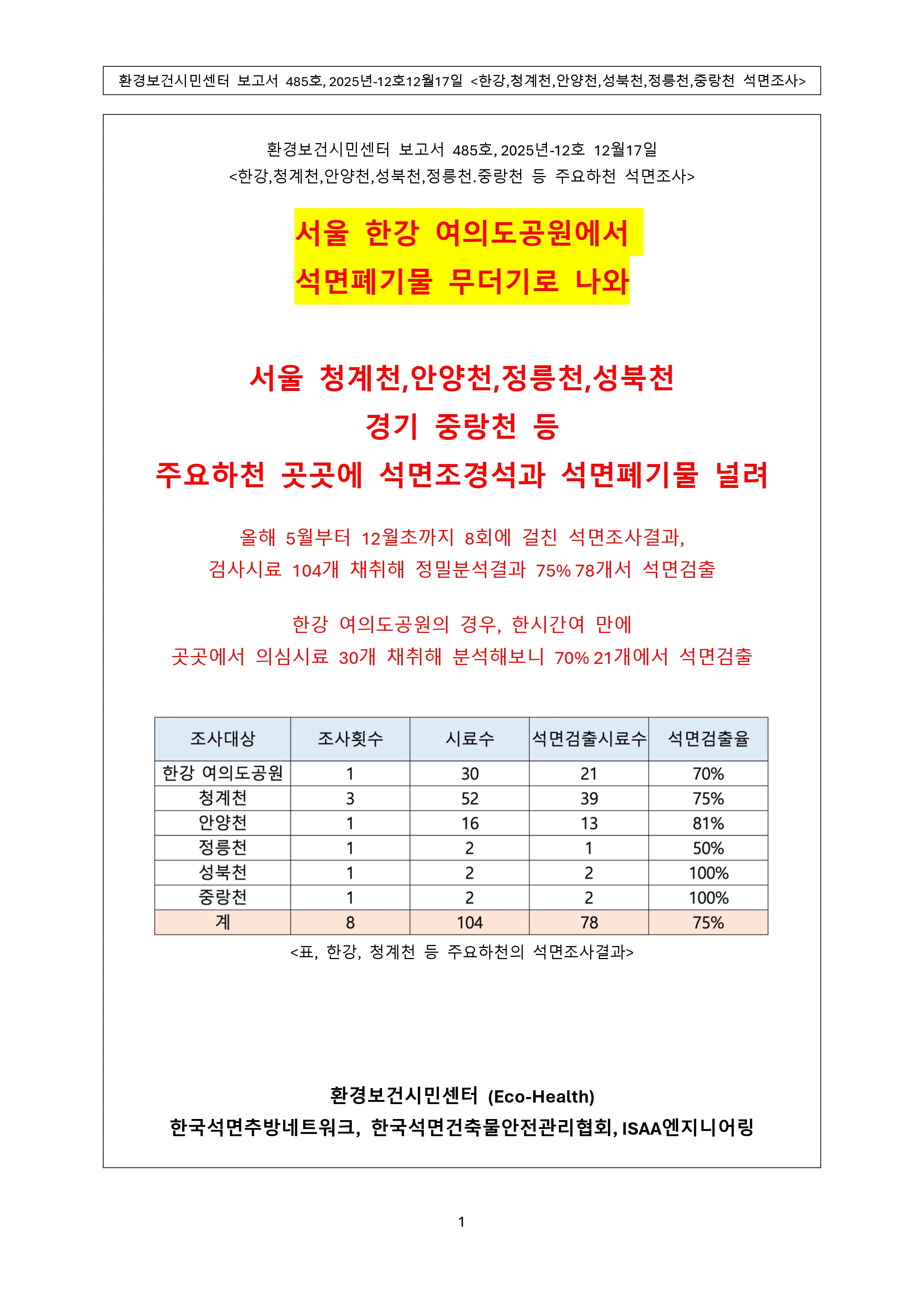 l 제목: 서울 한강, 청계천, 안양천, 정릉천, 성북천과 경기 중랑천 등 주요하천 석면조사결과보고서 발표 기자회견