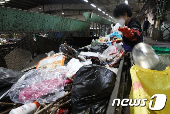 | 4일 오후 서울 송파구 송파자원순환공원에서 쓰레기선별업체 근로자가 재활용쓰레기 선별장에 쌓인 쓰레기를 분류하고 있다. 2020.5.4/뉴스1 © News1 이동해 기자 |