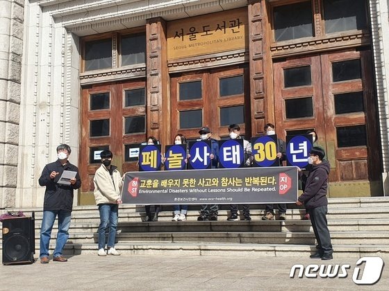 환경단체 환경보건시민센터는 16일 오전 11시 서울 중구 서울시청 앞에서 기자회견을 열고 "교훈을 얻지 못하면 사고와 참사는 반복된다"고 목소리를 높였다. 이 자리에는 석면과 가습기살균제, 마포 시영아파트 수돗물 페놀 등 건강피해자들도 참석했다.