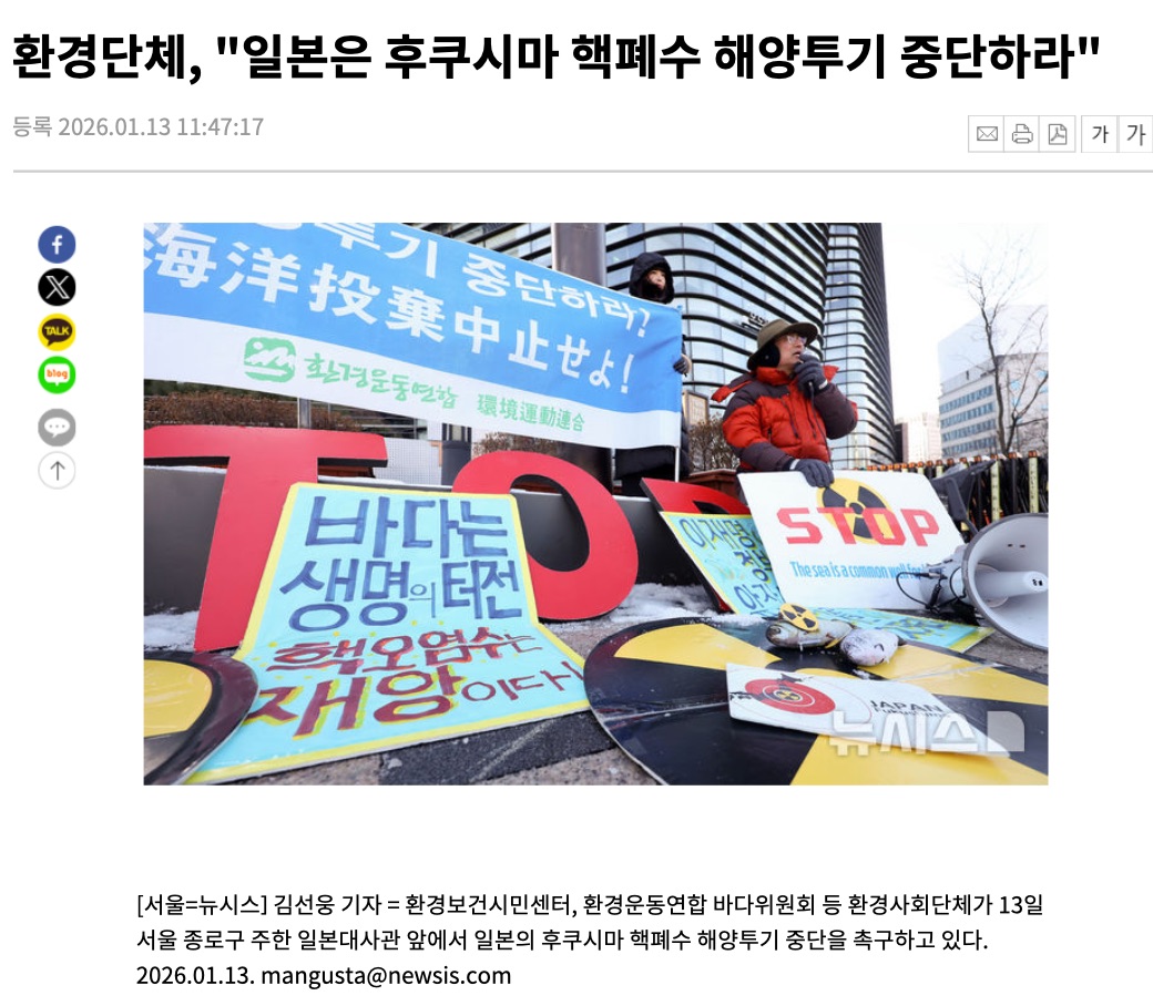 [뉴시스] "일본은 후쿠시마 핵폐수 해양투기 중단하라" 관리자 0 16 2시간전 2026년 1월13일 한일정상회담 1일차, 오전11시 서울 종로구 일본대사관앞은 그늘지고 매서운 바람이 몰아쳤습니다. 12일에 이어 2일차 후쿠시마 핵폐수 해양투기 중단요구 캠페인을 진행했습니다. 뉴시스의 보도사진 살펴보세요
