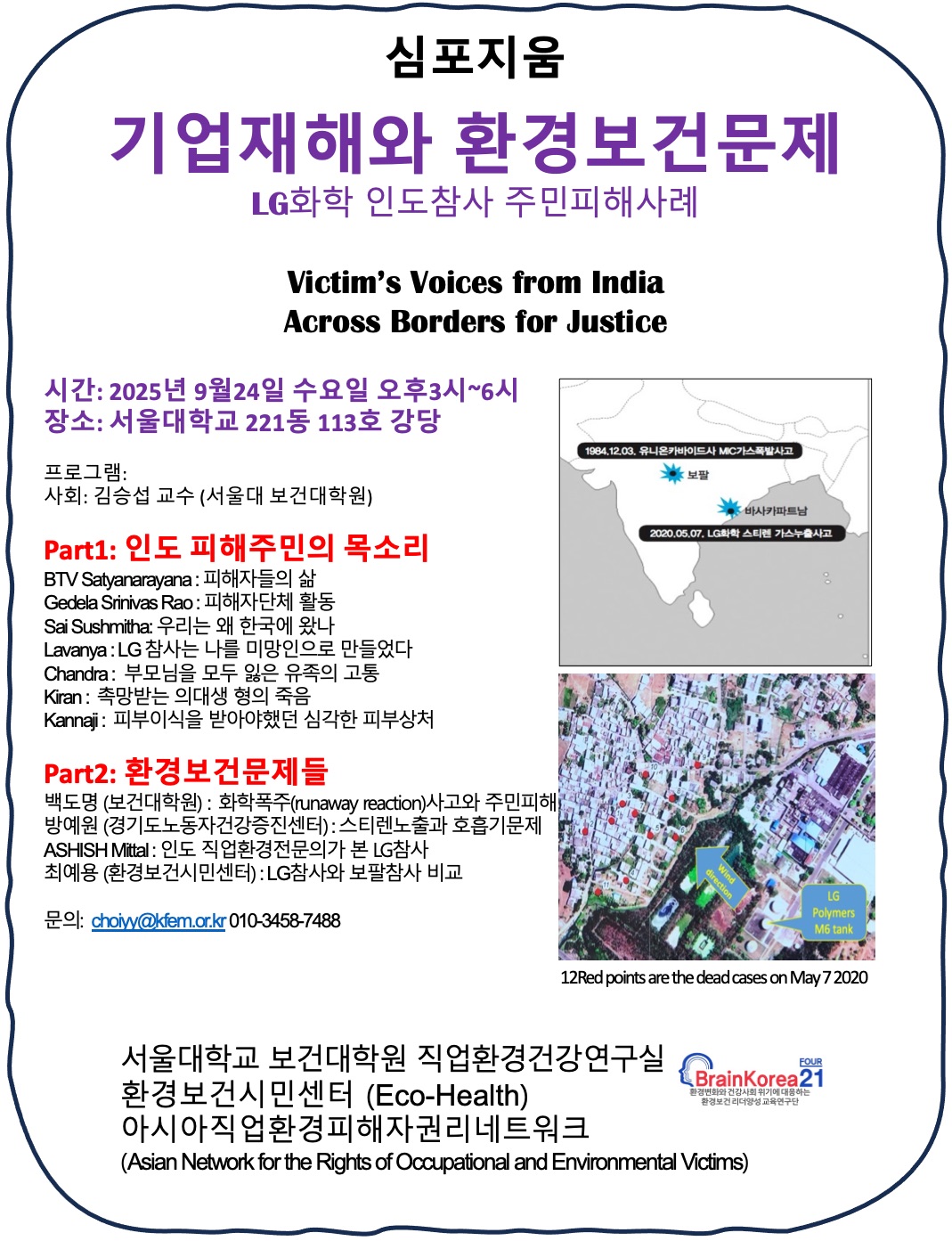 [보고서 492호] 2026년-5호, LG화학인도참사 2025년9월24일 서울대심포지엄 자료집 관리자 2026년 0 82 02.23 14:17 2026.02.23 14:26 환경보건시민센터 보고서 492호 LG화학인도참사 20250924 서울대 심포지엄 자료집.pdf (100.5M) + 1 2025년9월24일 서울대에서 열린 LG화학인도참사 인도피해자들이 방한해 직접 증언한 심포지엄의 발표자료입니다. [보고서 492호] 2026년-5호의 형식으로 올립니다. 파일 첨부합니다.