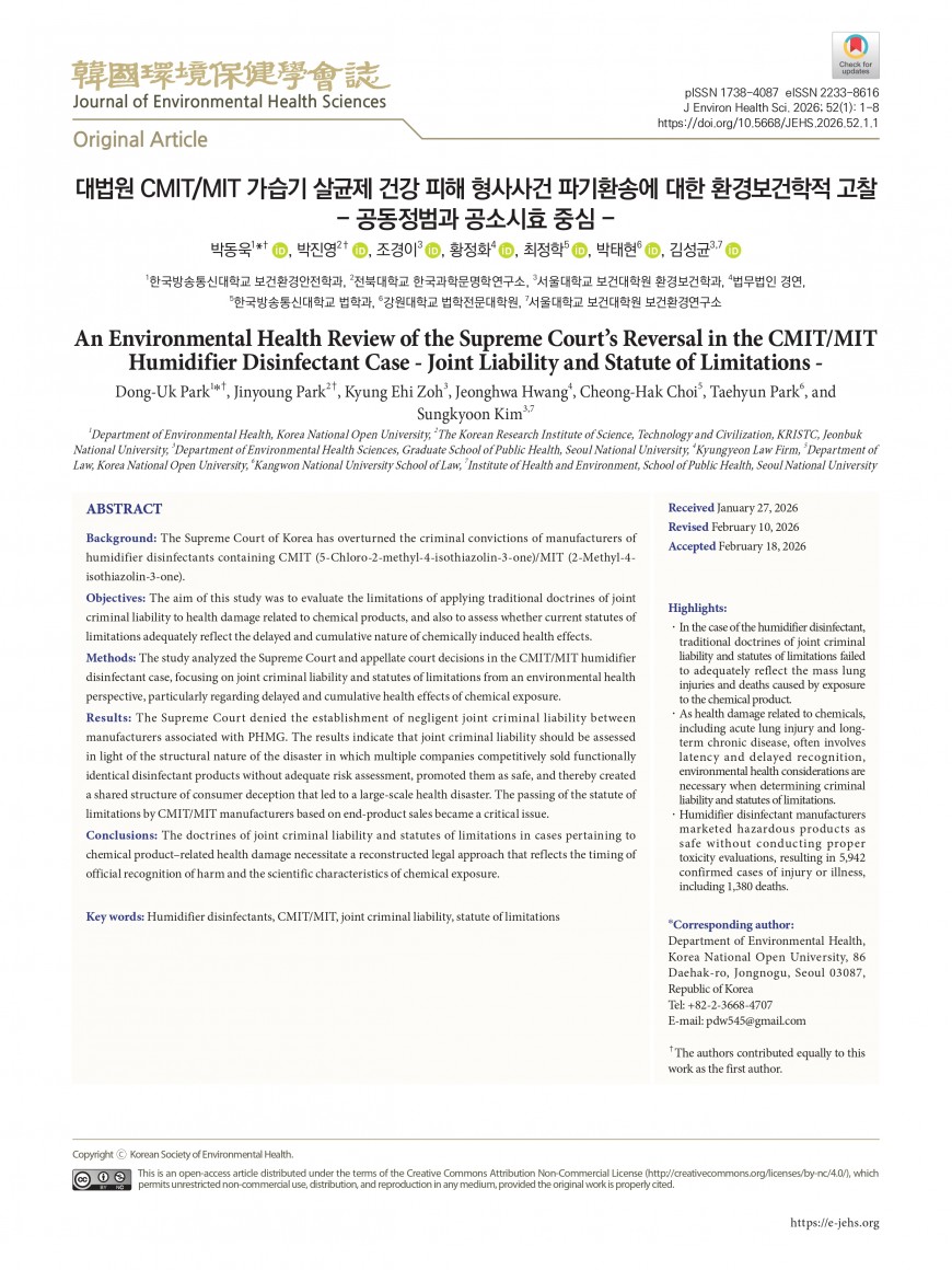 [논문] 대법원의 가습기살균제 형사사건 파기환송에 대한 환경보건학적 고찰 관리자 0 49 2시간전 2026.03.06 16:22 2026 대법원 가습기살균제 형사사건 파기환송 고찰.pdf (486.4K) + 1