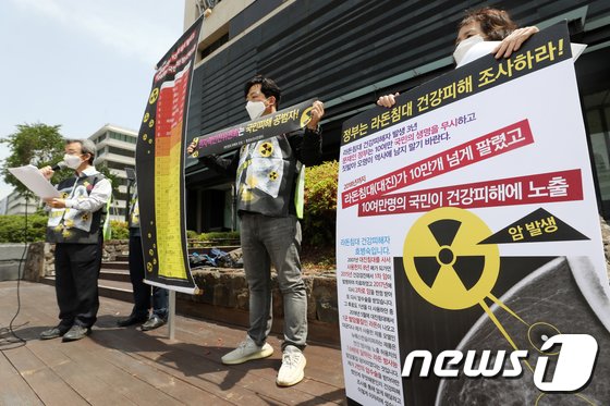 | 환경보건시민센터 관계자들이 서울 종로구 원자력안전위원회 앞에서 '라돈침대 환경보건사건 발생 3년 피해조사 및 대책요구 기자회견'을 하고 있다. 2021.5.6/뉴스1 © News1 민경석 기자 |