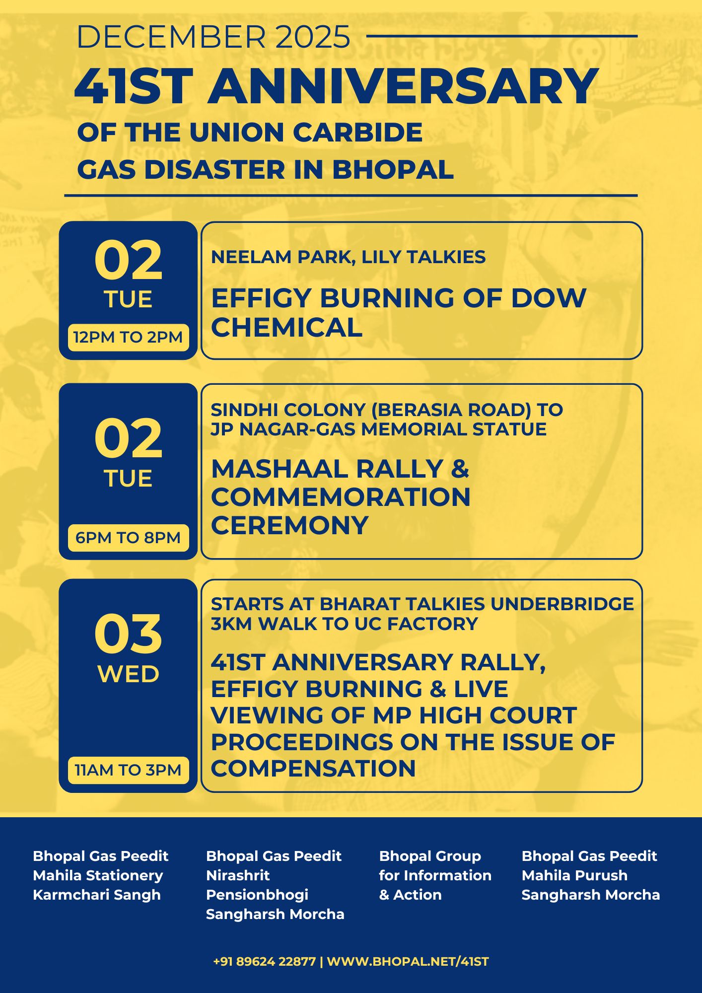 <  보팔참사 41주기 인도 현지행사 안내 포스터, 하루전인 12월2일 오후에 보팔 시내에서 가두행진 및 유니언 카바이드 화형식, 저녁에 추모식이 열리고, 12월3일에는 참사공장 앞에서 화형식 이어서 재판 방청이 이어진다는 안내입니다.>