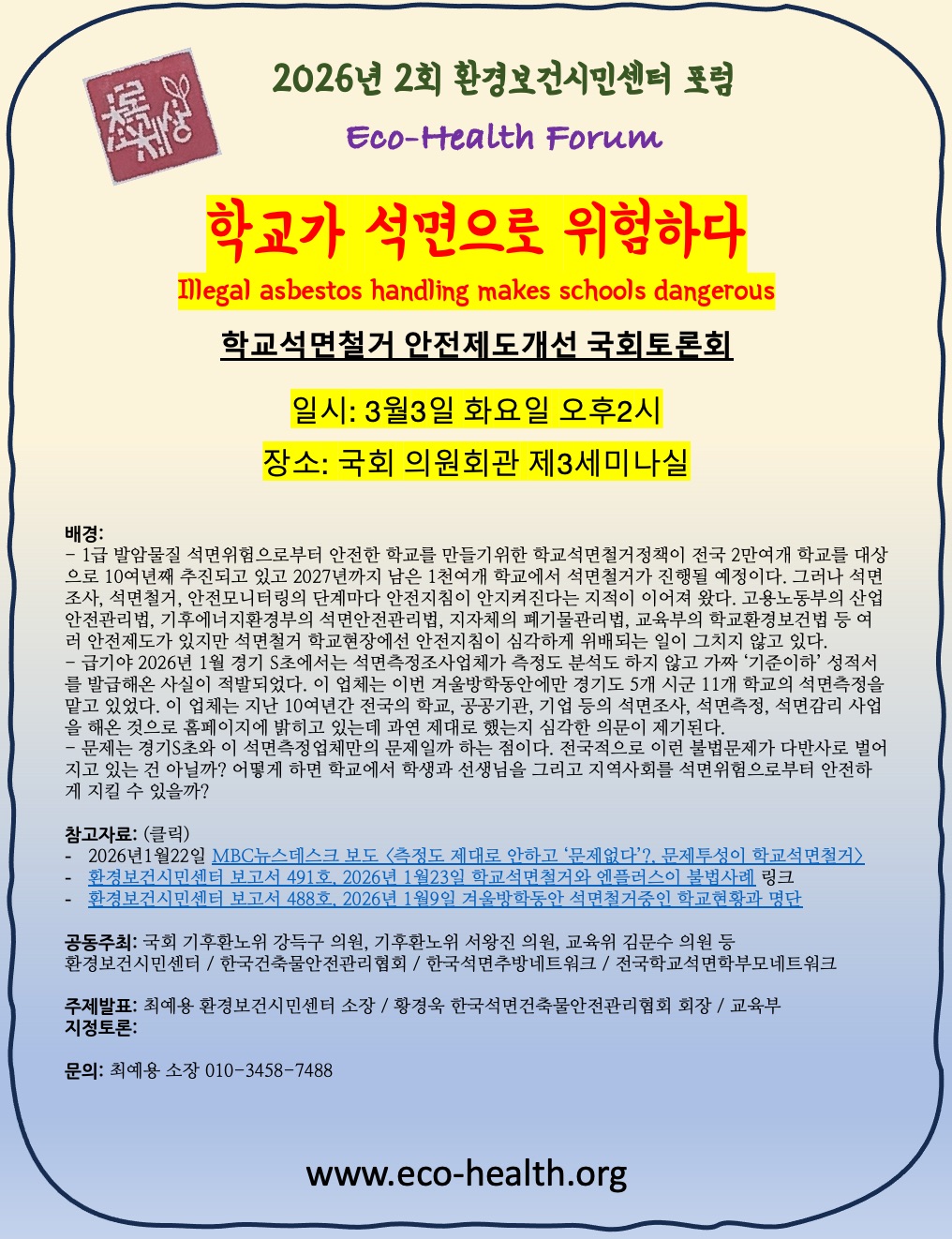 [2026년 3월3일] 학교석면철거 안전제도개선 국회토론회 관리자 0 39 2시간전 참고자료: (클릭)-2026년1월22일 MBC뉴스데스크 보도 <측정도 제대로 안하고 ‘문제없다’?, 문제투성이 학교석면철거> -환경보건시민센터 보고서 491호, 2026년 1월23일 학교석면철거와 엔플러스이 불법사례 링크 -환경보건시민센터 보고서 488호, 2026년 1월9일 겨울방학동안 석면철거중인 학교현황과 명단
