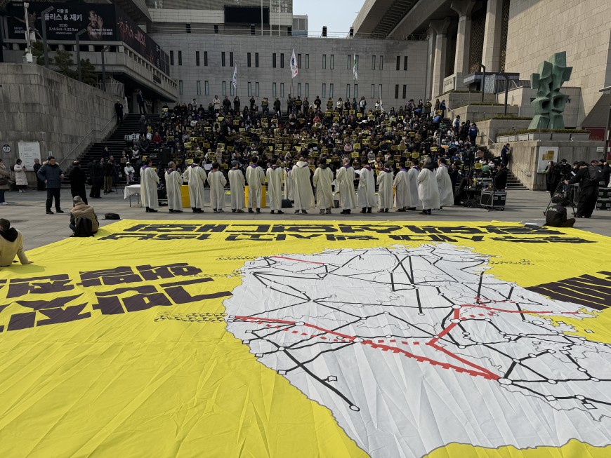 2026년 3월11일 후쿠시마 핵참사 15주기일 오후1시 서울 광화문광장 세종문화회관 계단에서 500여명의 시민들과 수녀, 가톨릭신자들이 모여 탈핵미사를 진행했습니다. 예수가 삽자가에 못박혀 돌아가시는 고통의 사순시기와 부활을 의미하는 짙은 보라색의 사제복을 입은 20여명의 신부들이 미사를 공동 집전하고 제주교구의 강우일 대주교가 대표로 집전한 가톨릭 미사입니다. 신부들과 참석자들은 모두 <탈핵>이라는 선명한 구호가 적힌 종이를 들었습니다. 미사가 집전되는 제대 앞에는 노란색의 핵드럼통 반쪽짜리가 놓였고 그 위에 십자가가 올려졌습니다. 신부들 뒤로 너른 광화문광장 바닥에는 가로세로 10미터는 족히 되어 보이는 커다란 천에 노란색의 탈핵이미지가 그려져 있습니다.