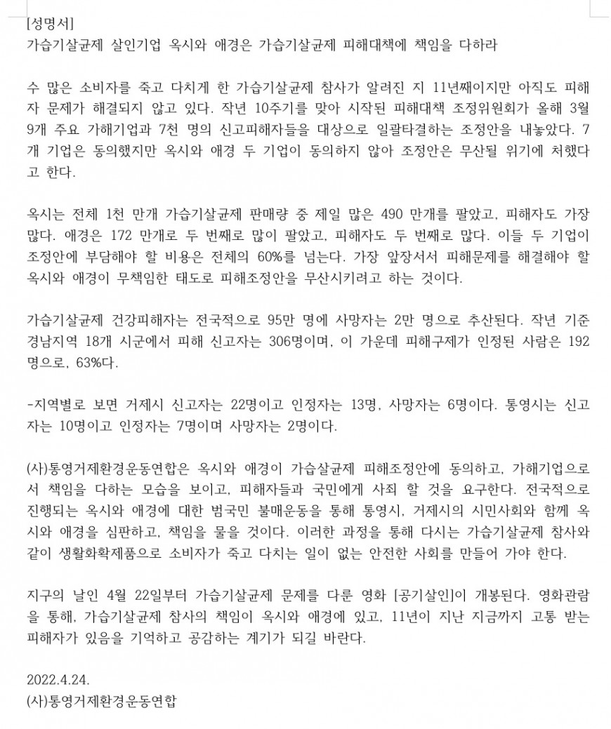 [전국 34곳 성명서 모음] 옥시와 애경은 가습기살균제 피해대책에 책임을 다하라
