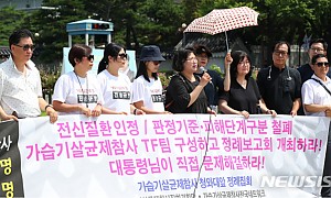 2019.08.06 뉴시스【서울=뉴시스】전신 기자 = 6일 서울 종로구 청와대 앞 분수대광장에서 가습기살균제참사전국네트워크가 정례 기자회견을 열고 가습기살균제참사 TF 구성 및 정례보고회 개최를 촉구하고 있다.