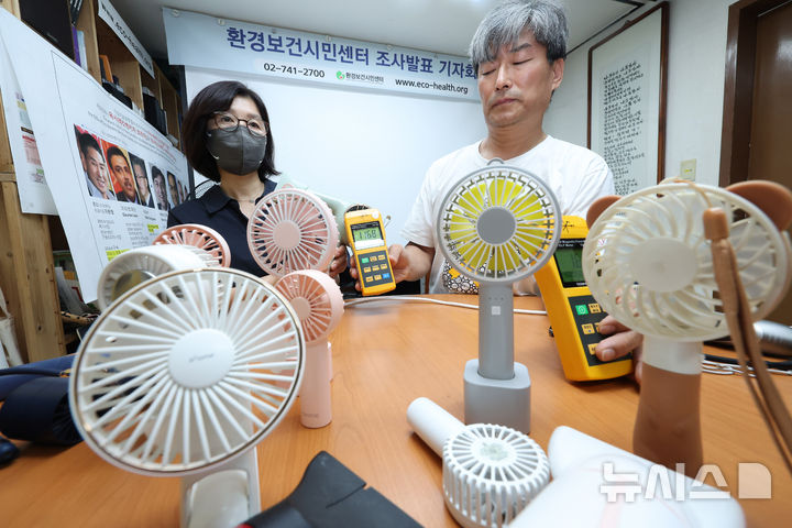 [서울=뉴시스] 김명년 기자 = 5일 오전 서울 종로구 환경보건시민센터에서 열린 생활속 전기전자제품 전자파 방출 측정 시연 기자회견에서 관계자가 목선풍기 전자파를 측정하고 있다. 2024.08.05. kmn@newsis.com
