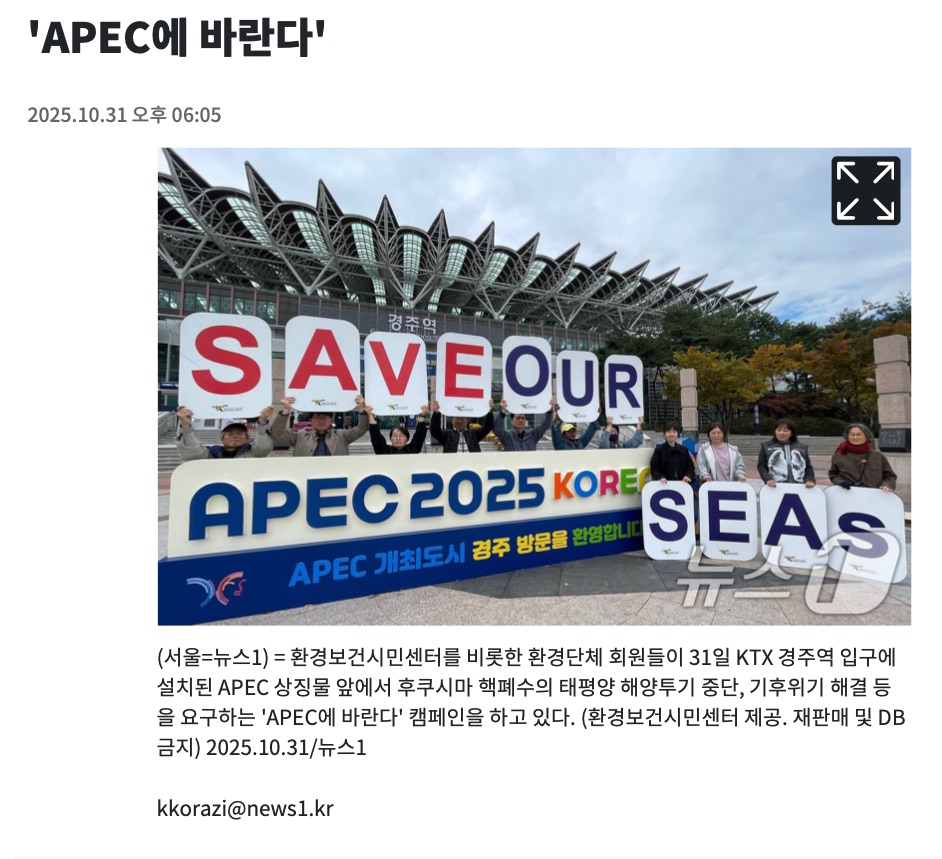 [뉴스1] 경주 찾은 환경단체, 'APEC에 바란다'