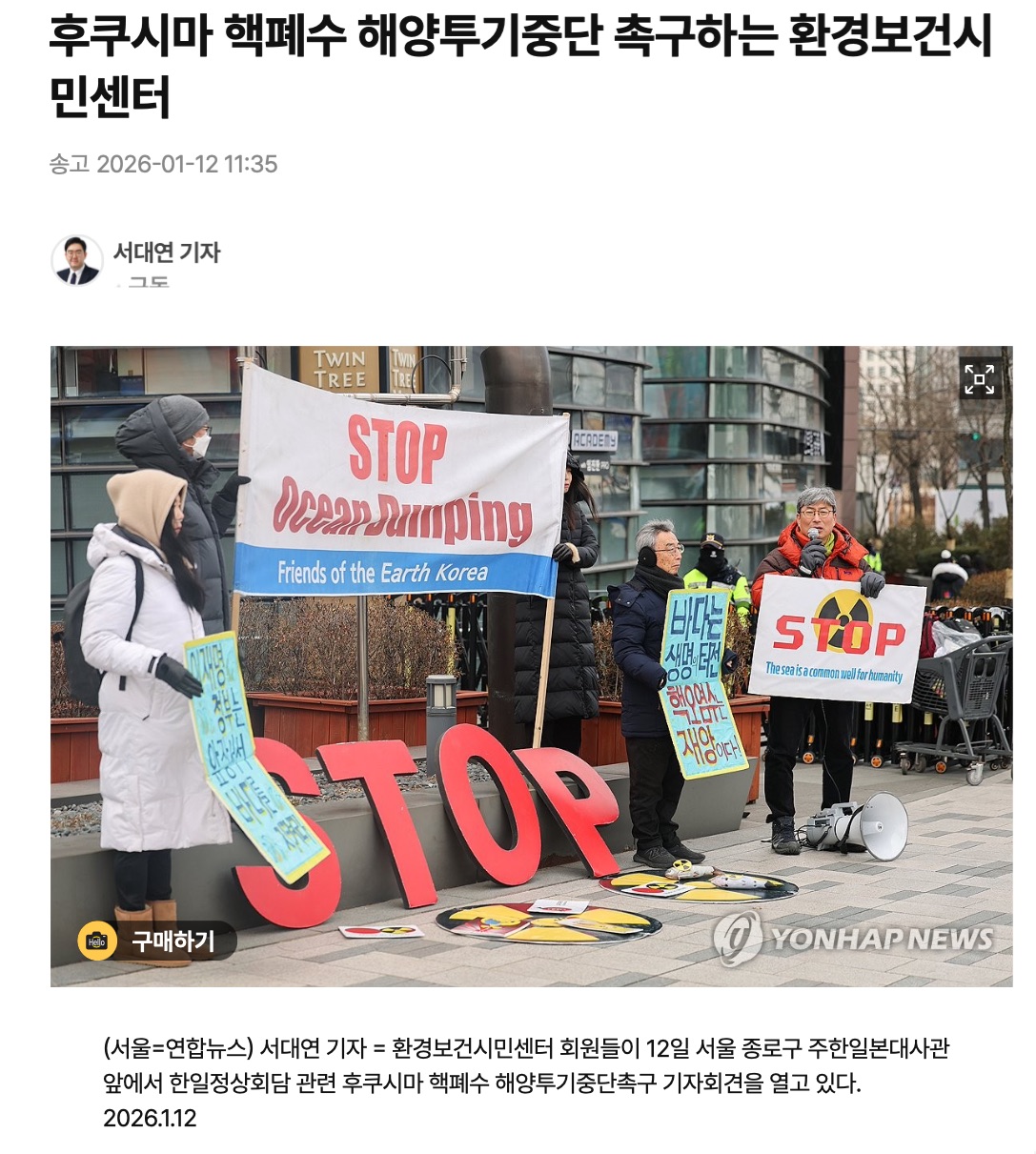 [연합] 한일정상회담 D-1, 핵폐수 해양투기중단 촉구하는 환경단체 관리자 0 12 3시간전 한일정상회담 D-1, 핵폐수 해양투기중단 촉구하는 환경단체송고2026-01-12 11:40송고 2026년01월12일 11시40분서대연기자구독이미지 확대헬로 아카이브 구매하기(서울=연합뉴스) 서대연 기자 = 한일정상회담을 하루 앞둔 12일 환경보건시민센터 회원들이 서울 종로구 주한일본대사관 앞에서 한일정상회담 관련 후쿠시마 핵폐수 해양투기중단촉구 기자회견을 열고 있다. 2026.1.12