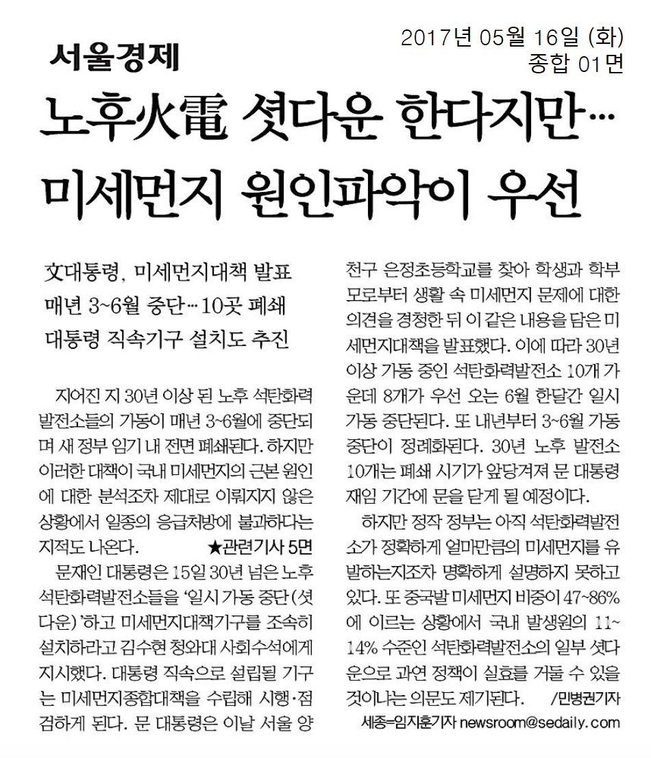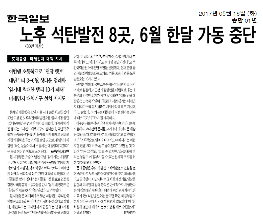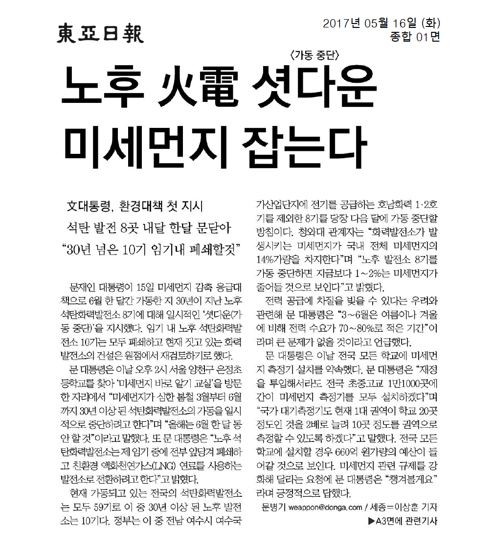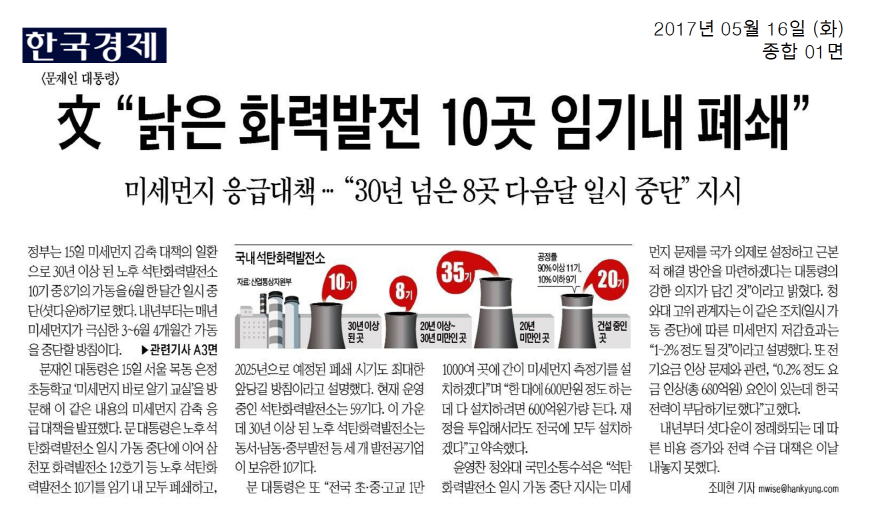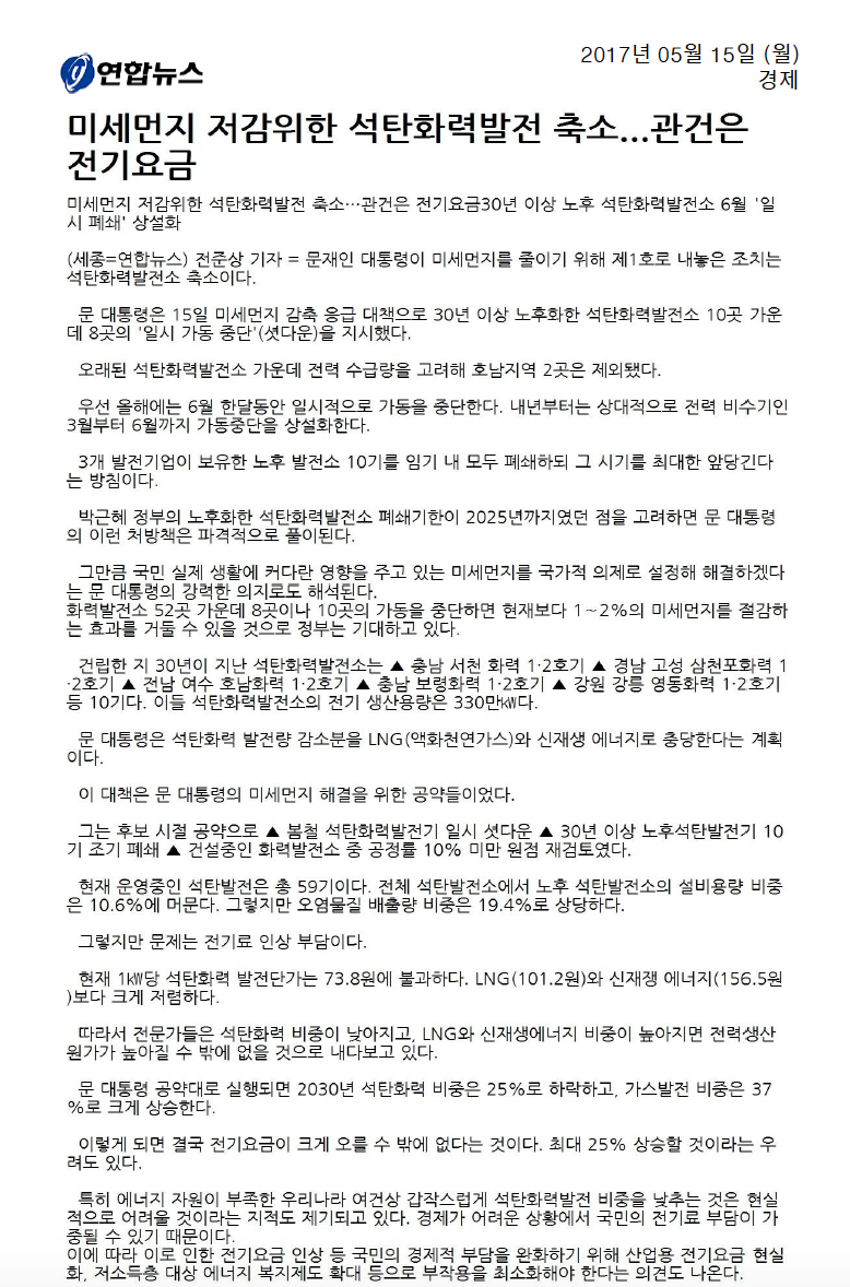 [기사모음] 미세먼지 저감위한 석탄화력발전 축소