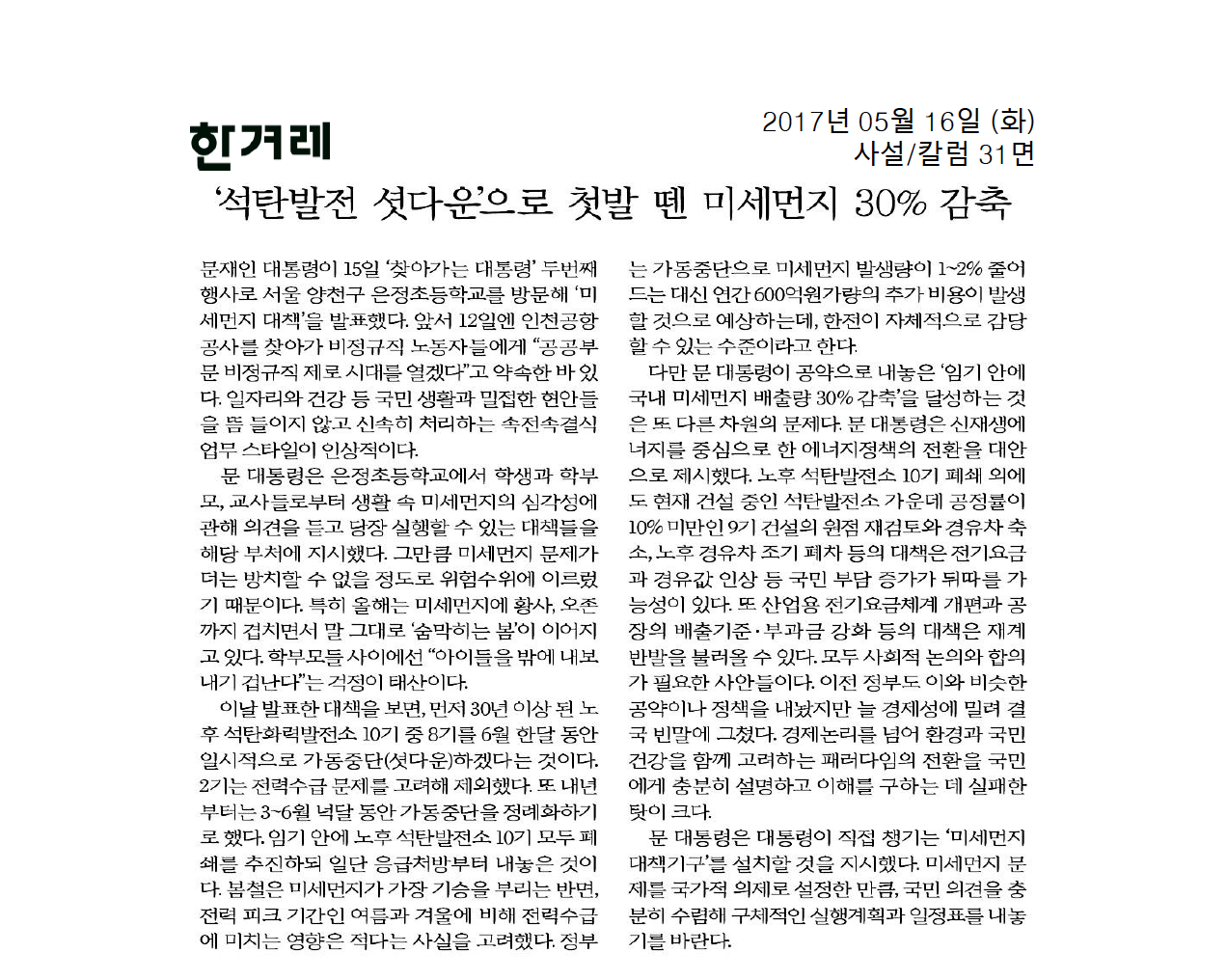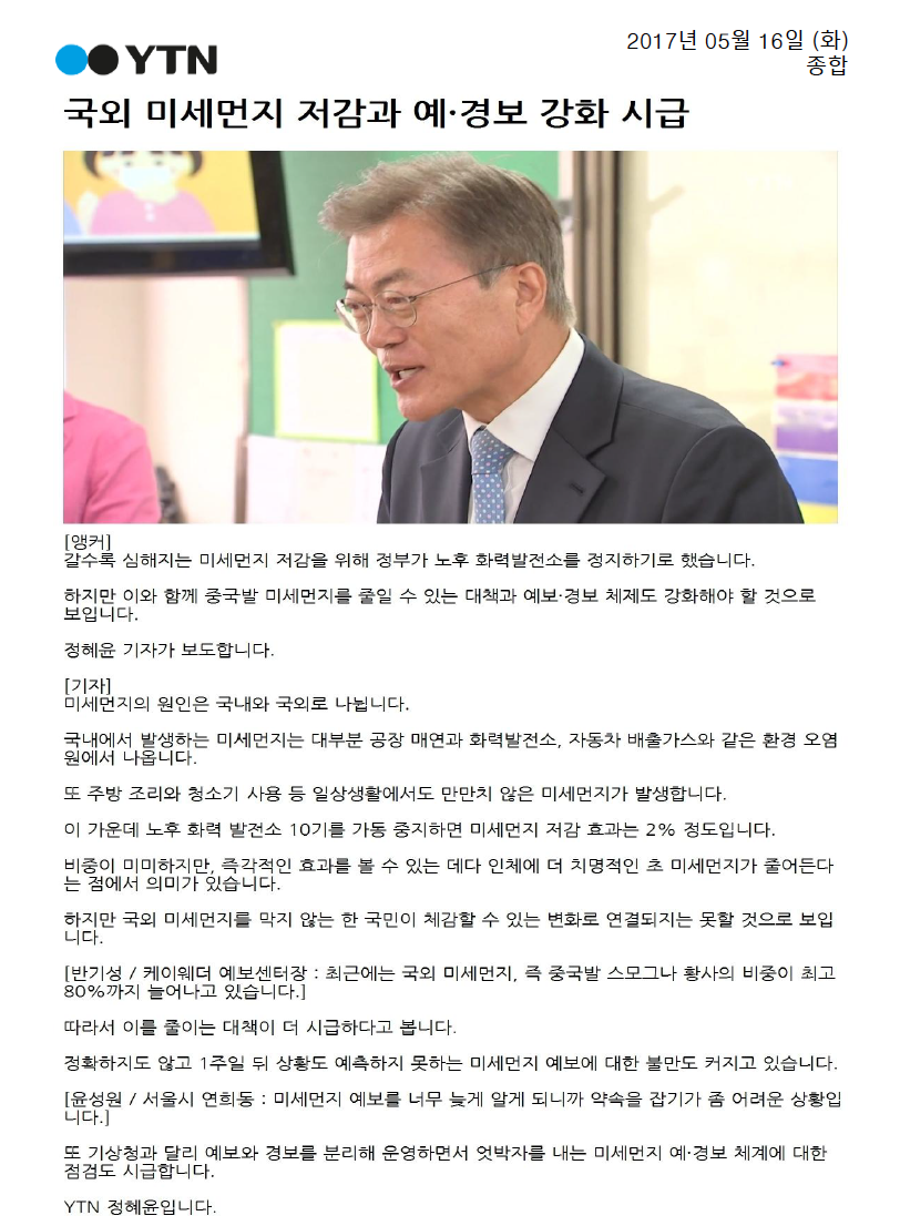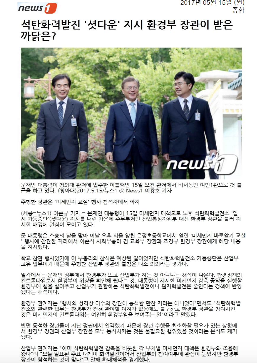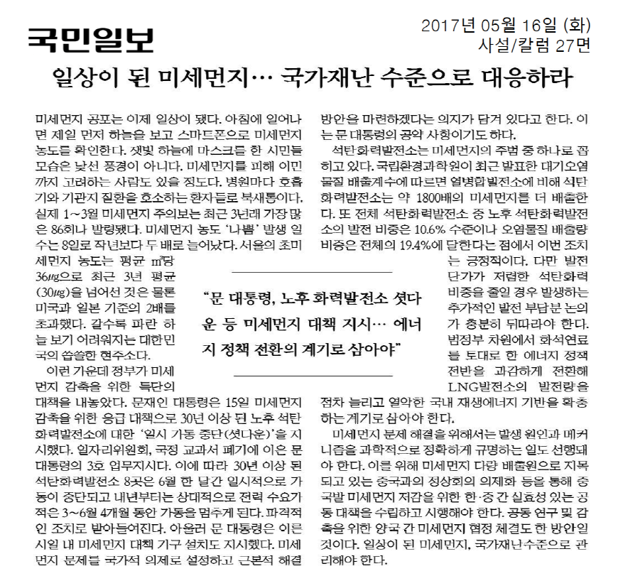 [기사모음] 미세먼지 저감위한 석탄화력발전 축소