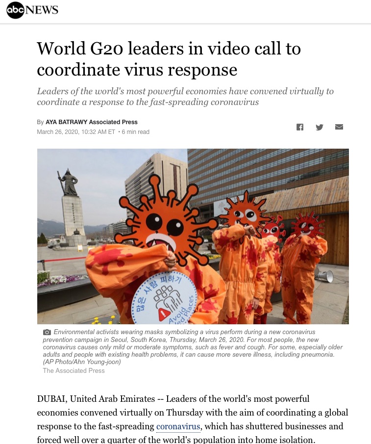 There are 44 news coverages in 12 overseas countries of North and South America, Europe and Asia Pacific about COVID19 related activities in Seoul March 26 and 30 respectively by Asian Citizen's Center for Environment and Health(환경보건시민센터): 31 USA like ABC, NBC, 2 UK The Guardian & The Telegraph, 2 New Zealand Aukland Press and NZ Herald and 1 each Japan Mainichi, Canada Trinity news, Bulgaria BTA, Philippines The Manila Times, Jamaica Stabroek news, India The Indianexpress, Malaysia The Star, Turkey Daily Sabah, Taiwan Taipei Times respectively and mostly using international news media AP or AFP photo reports. Here are some of them.