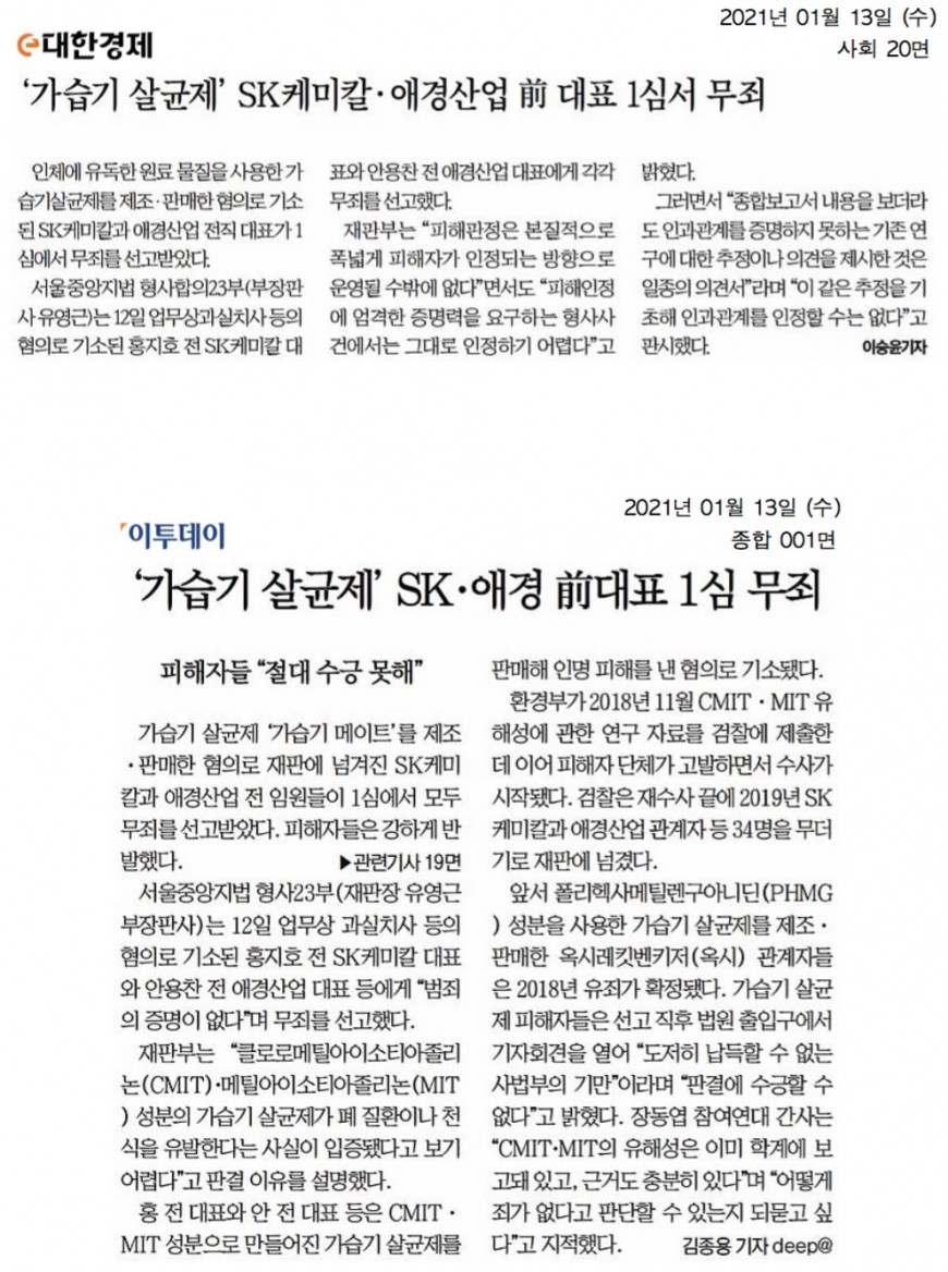 [기사모음-신문] SK 애경 등 1심 무죄판결