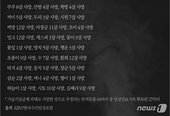 4일 KBVP한국수의임상포럼(대표 김현욱)이 지난 3월 사회적참사 특조위에 보고한 '가습기살균제 피해 사례 확대 및 제품 위해성조사'에 따르면 가습기살균제에 피해를 입은 것으로 추정되는 98마리의 반려동물 사례가 확인됐다.