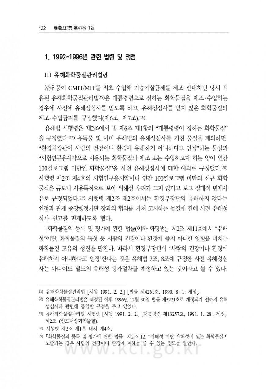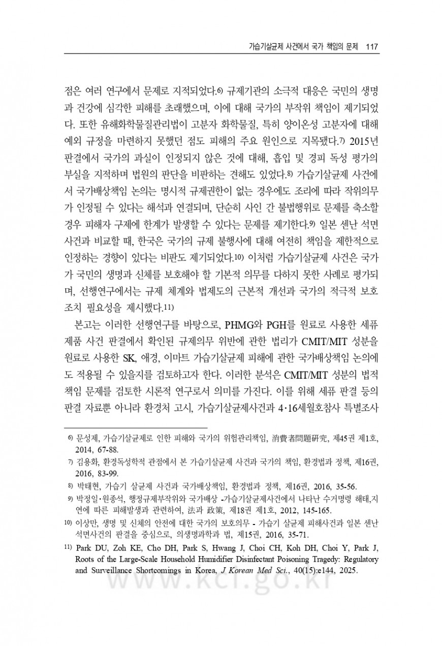 [학술논문] 가습기살균제 사건에서 국가 책임의 문제 - CMIT/MIT성분의 법적 쟁점 및 요건 검토 관리자 0 2109 05.15 13:20 2025.05.15 13:22 2025 박진영외, 가습기살균제 사건에서의 국가책임의 문제.pdf (639.2K) + 40 2025년 5월 환경법학회 학술지 <환경법연구> 47권1호에 실린 논문입니다. 저자들은 대부분 환경보건시민센터 운영위원으로 현재 진행중인 가습기살균제 사건의 민형사 소송에서 국가책임이 물어질 수 있도록 해야 한다는 취지에서 공동작업한 결과입니다.