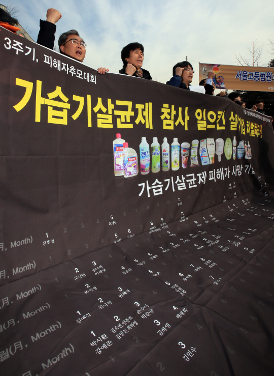 | 가습기살균제피해자와가족모임, 시민단체 환경보건시민센터 회원들이 3일 서울 서초동 중앙지법 앞에서 가습기 살균제 판결 규탄 기자회견을 하며 살균제로 인해 사망한 이들의 기일이 적힌 현수막을 들고 구호를 외치고 있다. (사진=연합뉴스) |