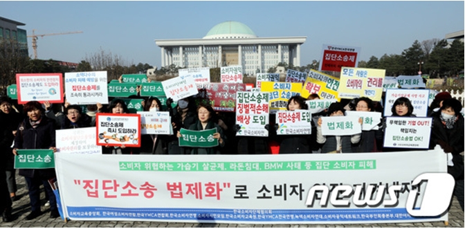뉴스1 박정호 기자 - 한국소비자단체협의회와 환경보건시민센터 관계자들이 17일 오전 서울 여의도 국회의사당 앞에서 집단적 소비자피해 재발방지를 위한 집단소송 법제화 필요 촉구 기자회견을 하고 있다. 이들은 이날 기자회견을 통해 "가습기 살균제 사건, 폭스바겐 연비조작 사건, 홈플러스 개인정보 유출 사건 등 소비자피해에 대해 구제절차가 진행 중인 가운데 올해도 대진 라돈침대 사건 등이 또다시 발생했다는 점에서 더욱 충격적"이라며 "대진 라돈침대 사건의 피해자들에 대한 조속한 피해구제와 함께 소비자 집단소송제 도입을 강력하게 주장한다"고 밝혔다.
