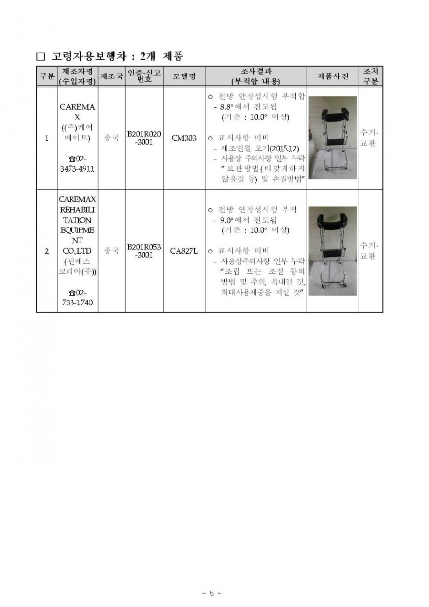 한편 일부 고령자용 보행차도 안전문제가 있는 것으로 밝혀졌다. ‘케어메이트’와 ‘핀에스코리아’가 각각 중국에서 수입한 ‘CM303’, ‘CA827L’ 모델은 노인이 경사진 곳에서 체중을 의지하고 이동할 경우 넘어질 가능성이 높았다.