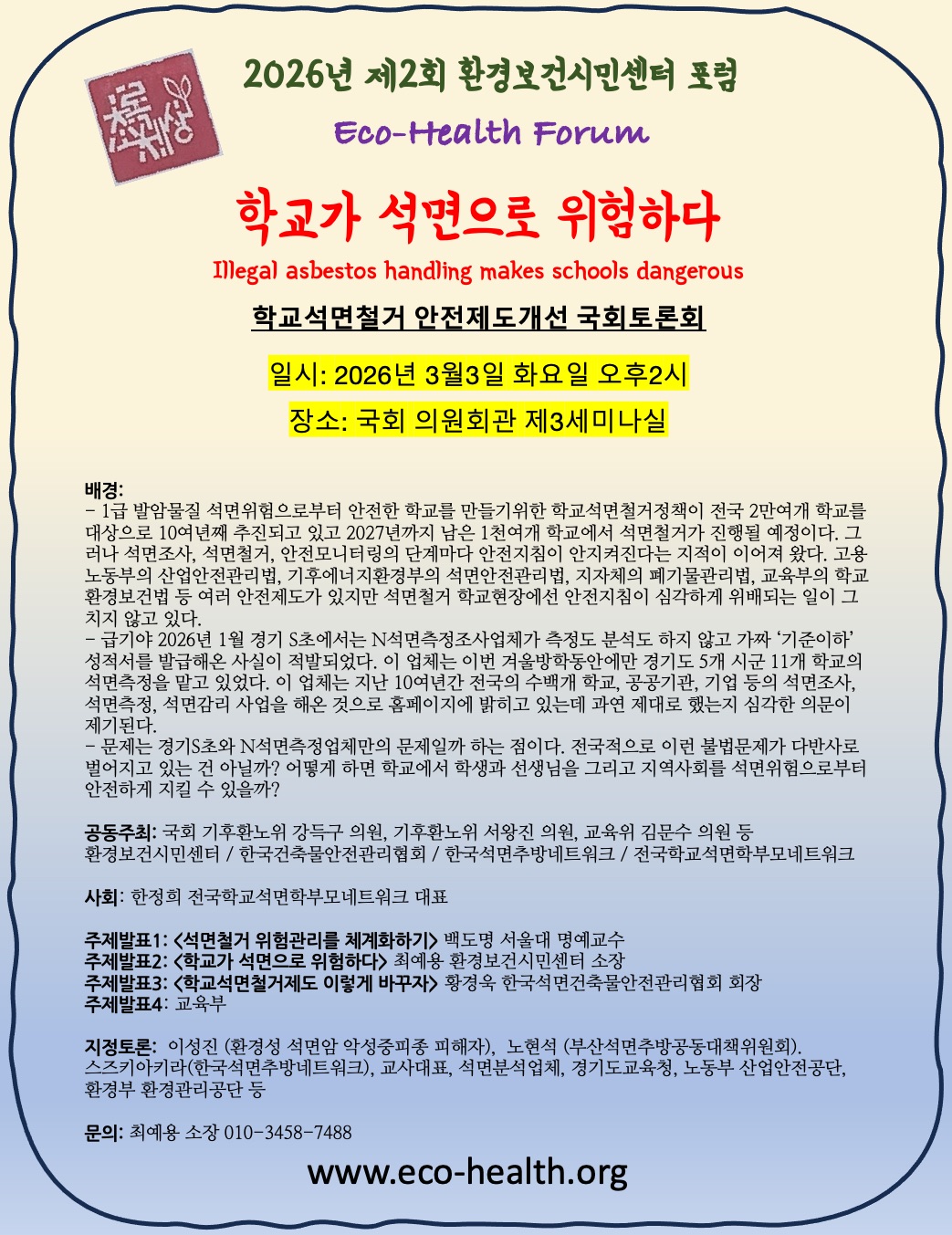 [2026년 3월3일] 학교석면철거 안전제도개선 국회토론회 관리자 0 327 01.29 16:15 참고자료: (클릭)-2026년1월22일 MBC뉴스데스크 보도 <측정도 제대로 안하고 ‘문제없다’?, 문제투성이 학교석면철거> -환경보건시민센터 보고서 491호, 2026년 1월23일 학교석면철거와 엔플러스이 불법사례 링크 -환경보건시민센터 보고서 488호, 2026년 1월9일 겨울방학동안 석면철거중인 학교현황과 명단