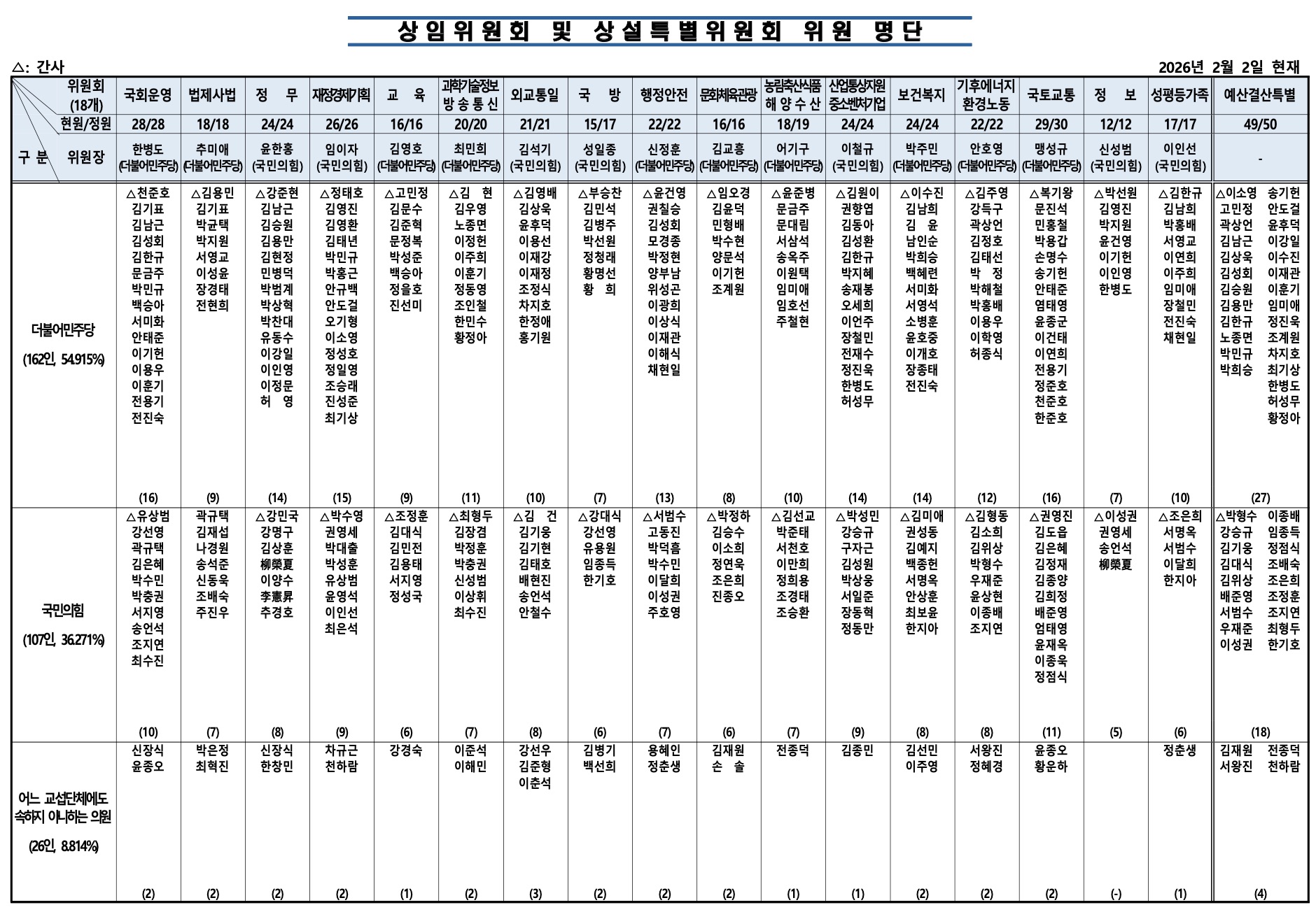 [2026년2월2일자] 국회 상임위원회 명단
